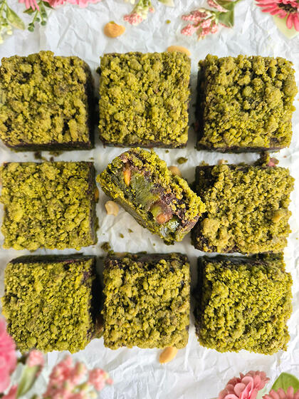 Blondie de matchá, morango e castanha, anko (doce de feijão japonês) e crumble de matchá.
